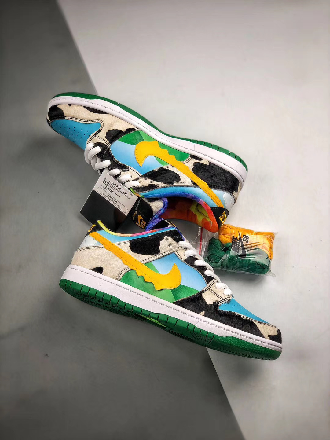 Коллаб Ben & Jerry’s x Nike SB Dunk Low «Chunky Dunky» будет сложно не заметить. Кроссовки получили дикий микс из разных материалов и оттенков. Здесь можно найти текстиль, резину, пластик и даже искусственный мех в «коровьих» оверлеях и на язычке. Сам же колорвей навеян природой, полем, небом и солнцем.